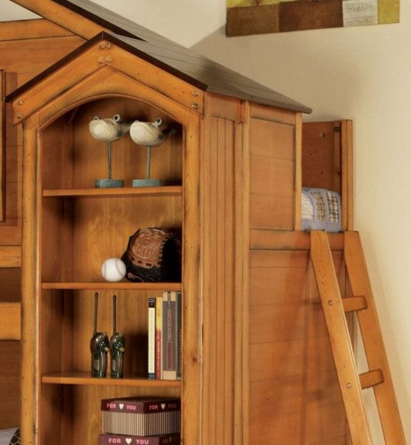 The Skyler loft bed in weathered white or rustic finish, with optional bookshelf, is sturdy enough to ensure safety of your children while offering a fun loft style for either homework or play. Put it in any youth bedroom for your children to create memorable adventures. This loft bed presents a rustic design with windows and roof above the upper part. Bookshelf cabinet is sold separately as a style option.