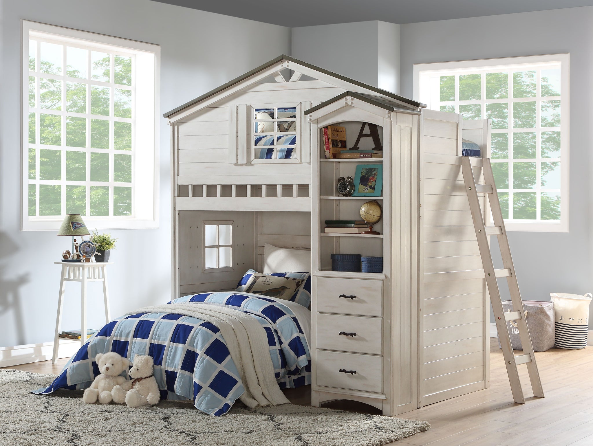 The Skyler loft bed in weathered white or rustic finish, with optional bookshelf, is sturdy enough to ensure safety of your children while offering a fun loft style for either homework or play. Put it in any youth bedroom for your children to create memorable adventures. This loft bed presents a rustic design with windows and roof above the upper part. Bookshelf cabinet is sold separately as a style option.